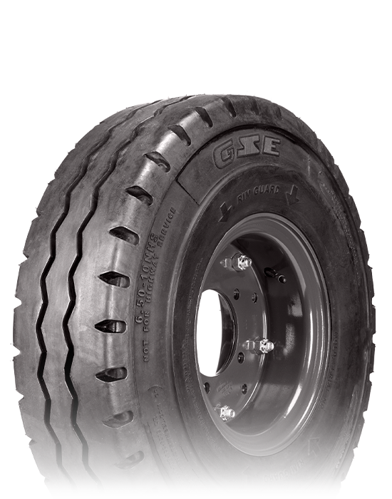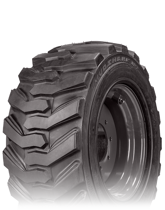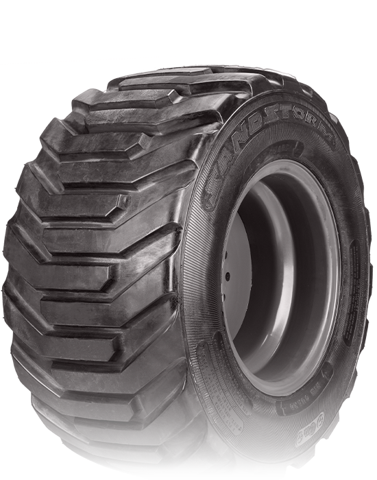 A rugged industrial tire featuring deep stepped lugs for better grip and cleaning. The addition of the reinforced sidewall and rim guard make it well suited for rough environments.